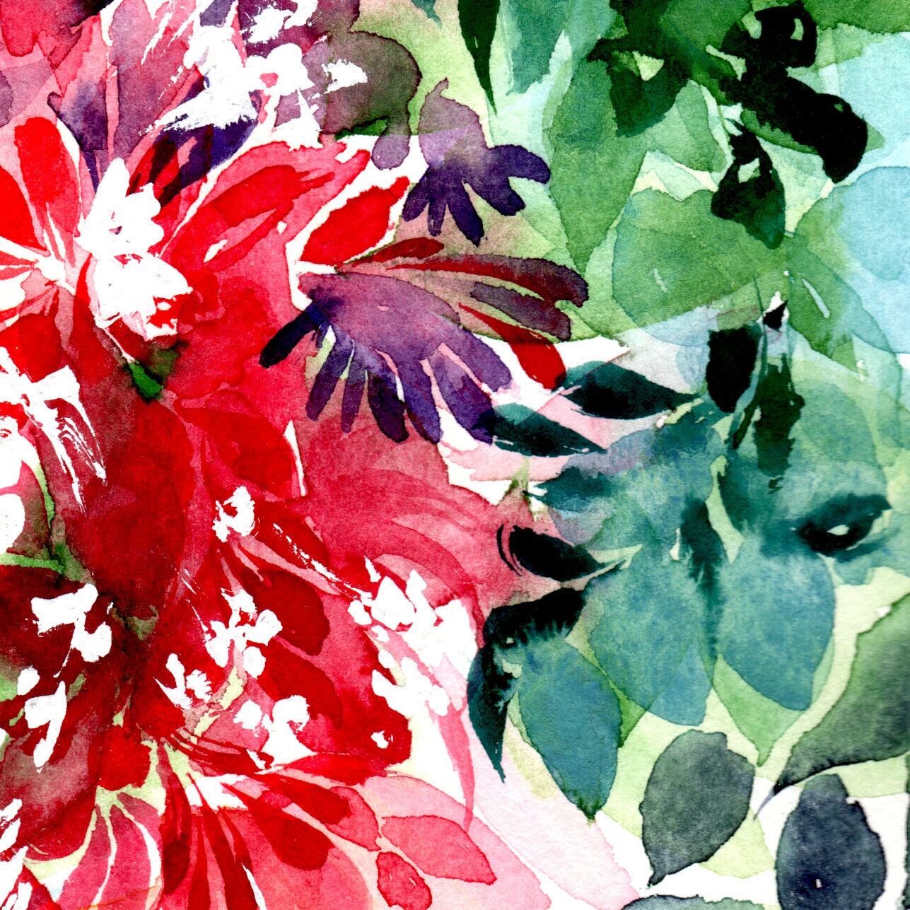 水彩のみでは表現できない、どこか日本を感じさせる色合いを心がけております。